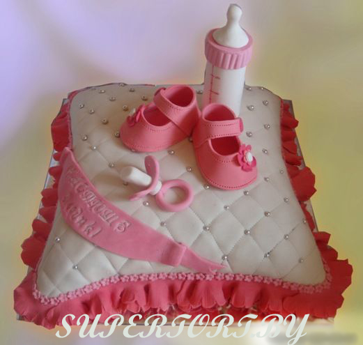 Торт одноярусный в виде детской подушки от 3 кг., фигурки бутылочки и сандалики оплачиваются отдельно.